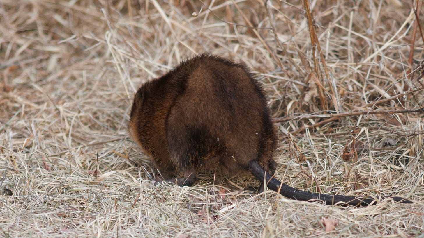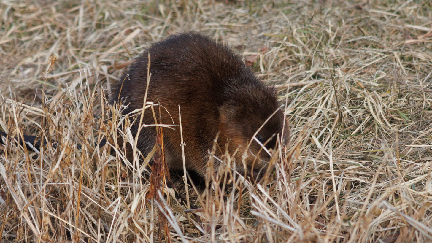 This muskrat was foraging in the grass near a road. I stopped and got a couple of shots, with one of them showing the long and scaly tale.